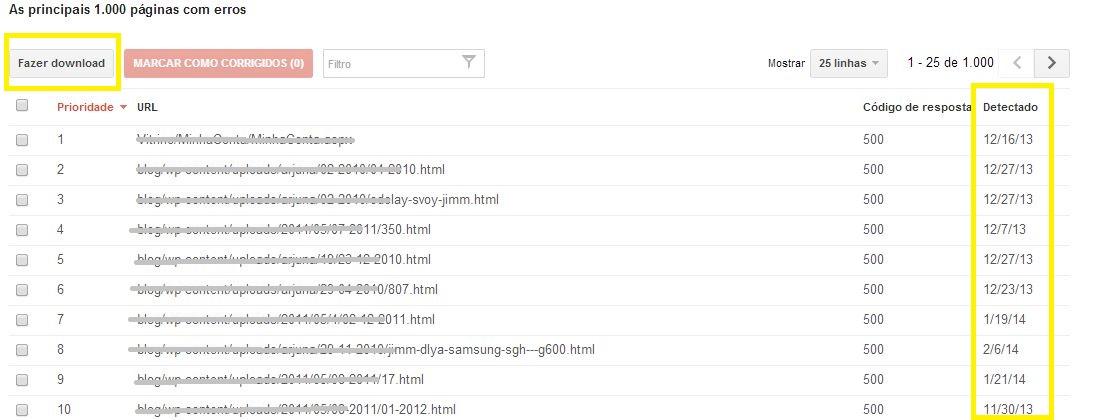 Nessa área você poderá visualizar quando ocorreu o erro, com qual URL, e qual é o erro apresentado. Você então poderá exportar uma planilha (*.csv)