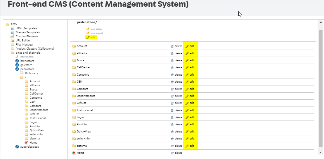 - A tela que foi aberta apresenta todas as pastas que estão no primeiro nível do site. Para cada pasta pertinente, clique em Edit - para a home, considere o botão do topo;