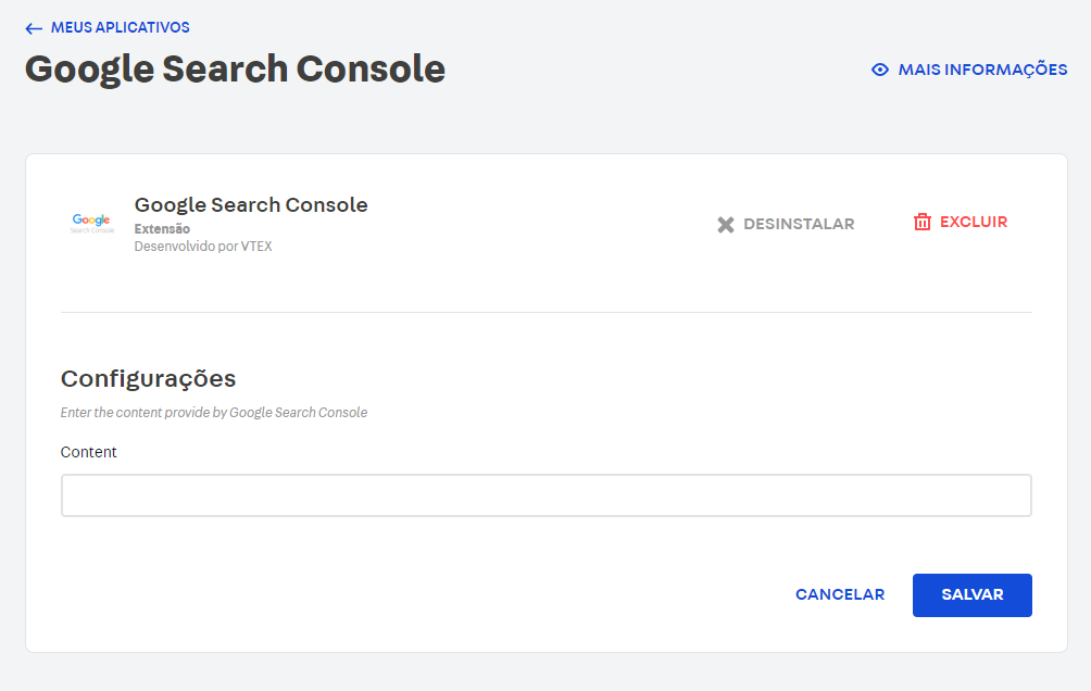 contentda metatag que copiou do Google Search Console anteriormente. Por exemplo, se a sua metatag for o seguinte<meta name="google-site-verification" content="{contentID}" />, adicione no campo Content apenas o que está dentro de{contentID}. - Clique