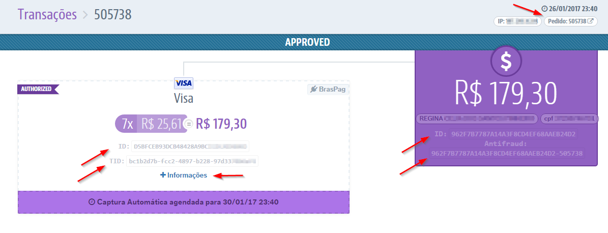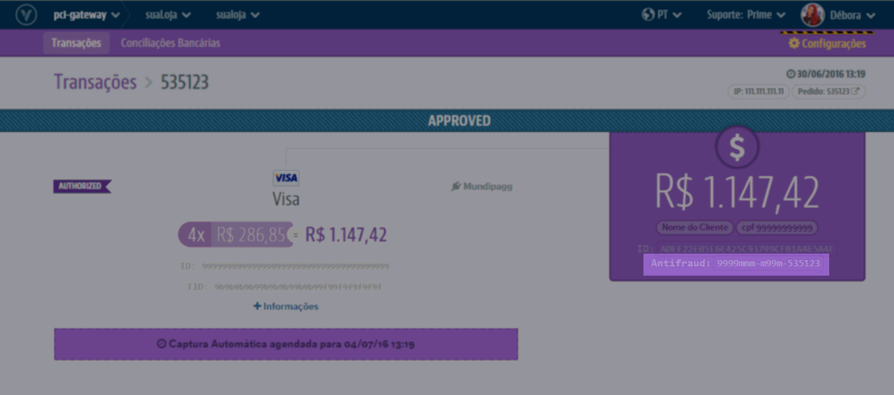 No lado direito há uma caixa que contém o valor total do pedido, os dados do cliente, o ID desse pedido e o número de identificação do Antifraude (caso exista na operação).