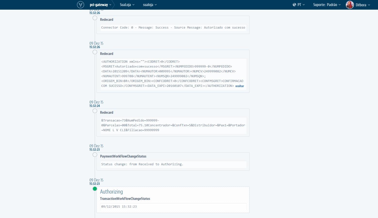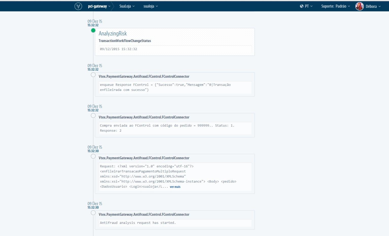 A parte mais importante dessa tela é o log de interações da transação. Aqui fica registrada toda a comunicação da VTEX com os afiliados cadastrados – antifraude, gateways e adquirentes –, inclusive mensagens de sucesso e erro, com seus respectivos códigos.