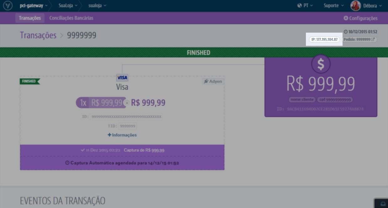 O IP do cliente é coletado no momento da compra e pode ser visto no campo superior da tela da transação, conforme imagem abaixo.