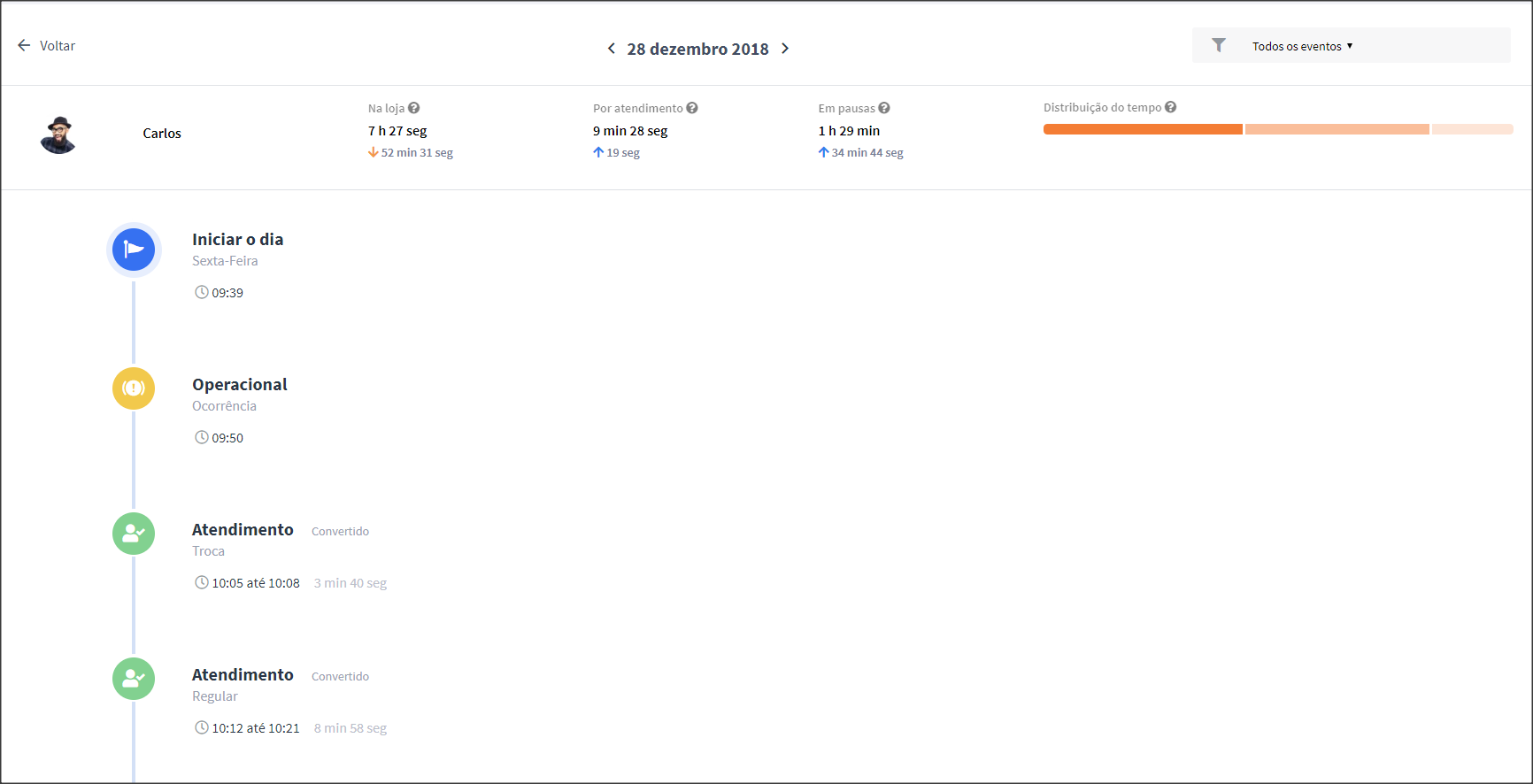 • Na loja: mostra o tempo médio que os vendedores permanecem na loja durante o período selecionado, comparando o desempenho individual com a média da loja.