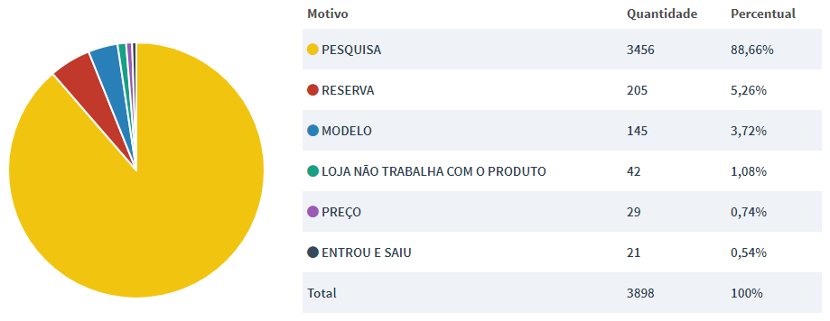 O relatório Motivos de perdas apresenta as razões registradas para vendas não concluídas, a quantidade de ocorrências para cada motivo e o percentual correspondente.