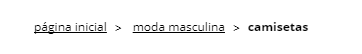 Se, como neste exemplo, o usuário acessar diretamente a página de um produto da categoria Camisetas, o breadcrumb exibido na página do produto lhe dará a informação de que o usuário se encontra nessa categoria (Camisetas), que por sua vez está abaixo do departamento Moda masculina.
