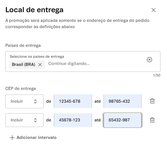 CEP de entrega: permite configurar intervalos de CEP para limitar a aplicação da promoção a regiões específicas.