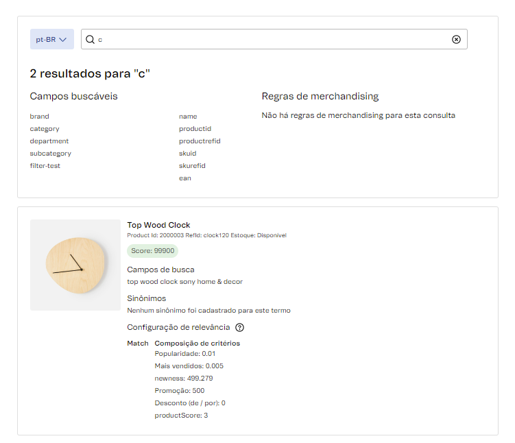 - Configurações e regras de busca (configurados no VTEX Intelligent Search).