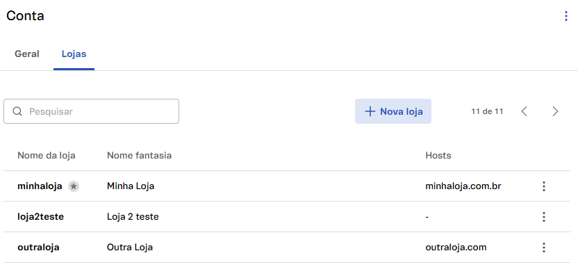 Ao clicar na aba Lojas, na parte superior da tela, você verá uma lista com as informações de todas as lojas criadas na sua conta VTEX.