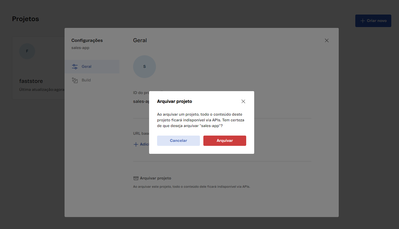 O arquivamento de um projeto desativa a API e o acesso ao seu conteúdo. Para arquivar um projeto, siga os passos abaixo: