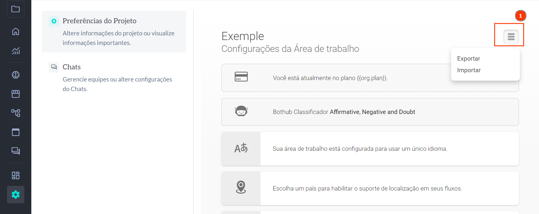 Para chegarmos na página de importação de fluxo basta ir ao menu de opções e clicar no botão importar nas configurações gerais da organização.