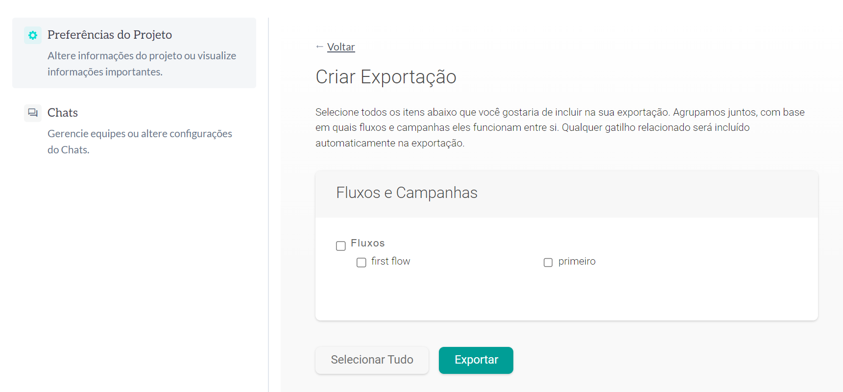 Já na página de exportação, ela irá te exibir todos os fluxos e campanhas daquela organização, estando eles agrupados por uso, ou seja, todos os fluxos de um mesmo grupo interagem entre si. Caso você exporte apenas um fluxo de um grupo, você pode ter problemas em seu funcionamento