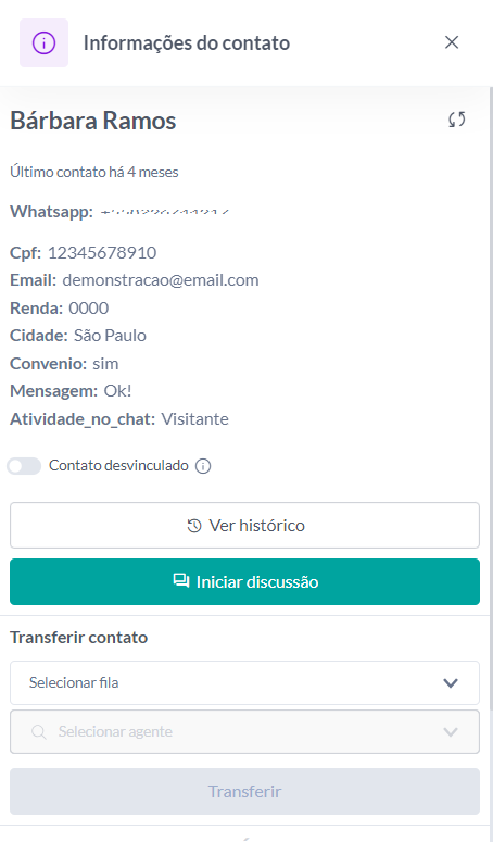 Ao clicar na foto ou nome do contato em qualquer área da conversa é possível acessar a sidebar de informações do contato, onde é apresentada a foto do contato em tamanho maior, os dados como canal pelo qual o contato está conversando, horário do último contato, função de transferir chat e galeria de mídias do contato.