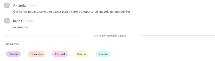 Ao visualizar o histórico do contato o agente pode ver o início do atendimento, o histórico com o Bot e os acontecimentos do chat, por fim as tags usadas para classificar o chat em si.