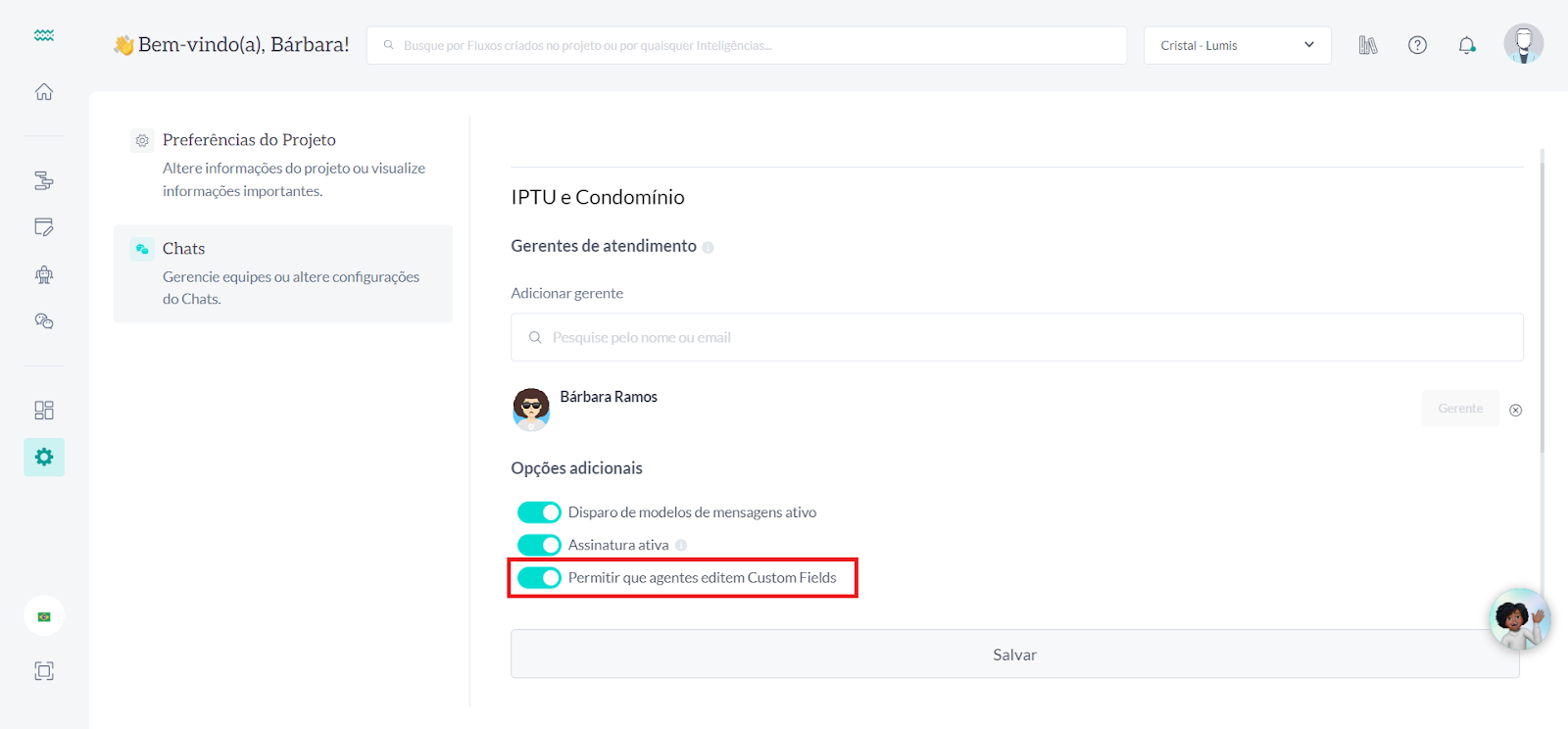 Caso seja necessário, o agente poderá alterar campos de contato do cliente, isso facilita principalmente aqueles que estão com algum dado errado ou até que precise atualizar alguma informação. Para ativar essa função de edição, basta clicar em configurações e setores, abra o setor e ative a função de edição de Custom Fields, como mostra a imagem abaixo: