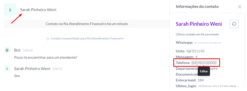 A função de transferir chat serve para direcionar o contato para um setor, fila ou agente específico, essa função pode ser acessada na área de informações do contato.