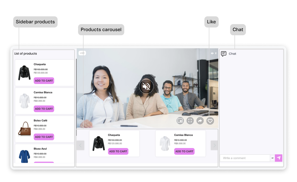 - Carrossel de produtos: exibe um carrossel de produtos em destaque localizado na parte inferior do reprodutor de mídia durante o evento ao vivo.