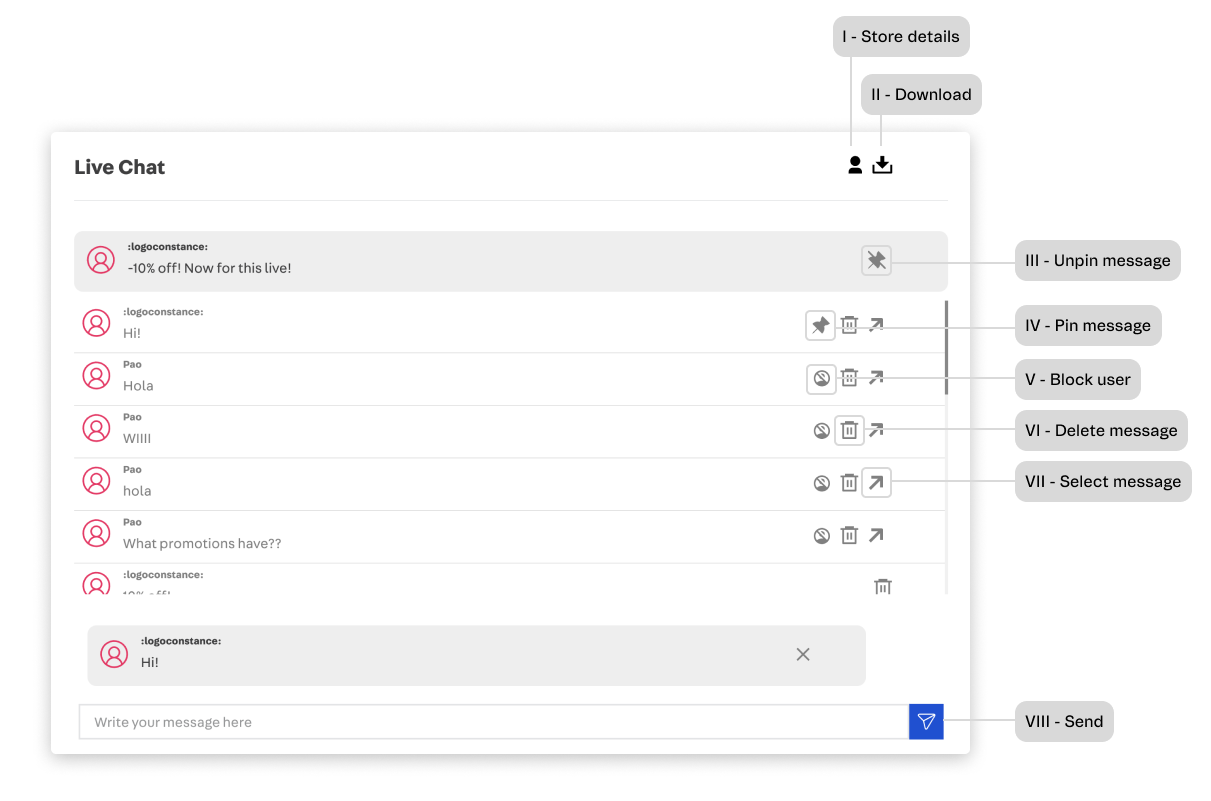 - V - Bloquear usuário: bloqueia o usuário ao clicar em uma mensagem enviada por ele no chat, evitando que o usuário envie novas mensagens. Para isso, clique no ícone do usuário bloqueado e, em seguida, clique em