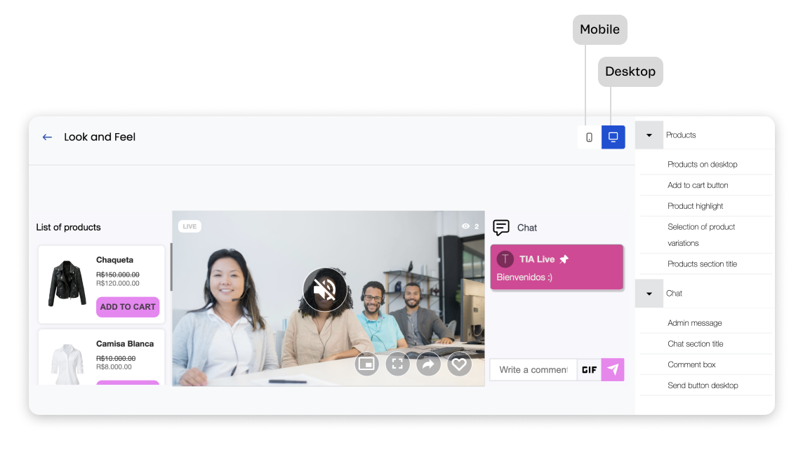 Para criar uma experiência personalizada e visualmente atraente para o evento ao vivo, você pode personalizar a aparência do aplicativo Live Shopping. Siga os passos abaixo para configurar a aparência para a visualização em dispositivos móveis e desktop: