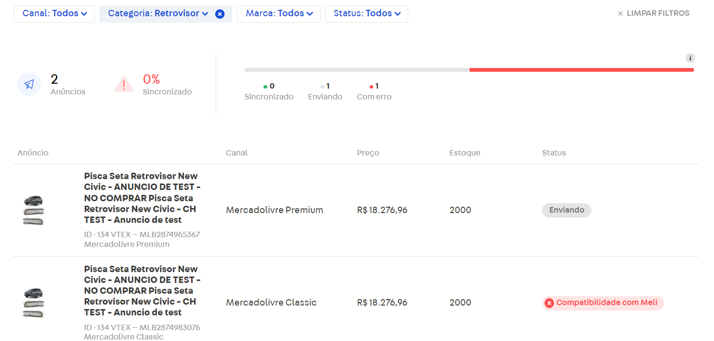 Os anúncios que apresentarem erro, não serão enviados ao Mercado Livre até que seja corrigido.