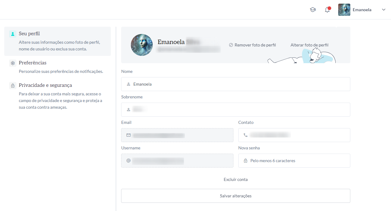 Clicando no ícone à esquerda clique em Seu perfil, nessa sessão pode editar seu nome, sobrenome e o contato da sua conta, além de poder, trocar a senha, caso necessário. Poderá também colocar uma imagem para o seu perfil. Digite as alterações e clique em salvar alterações que as informações serão atualizadas.