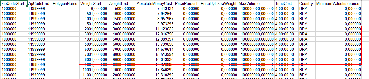 PolygonNameIdentificação do polígono definido na função de geolocalização.Para usar a geolocalização, após preencher a coluna PolygonName com os valores desejados, preencha as colunas ZipCodeStart e ZipCodeEnd com o valor 0.