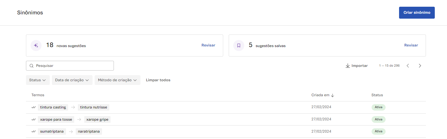 Após revisar todas as sugestões, feche o modal para acessar a listagem de sinônimos configurados na sua loja.