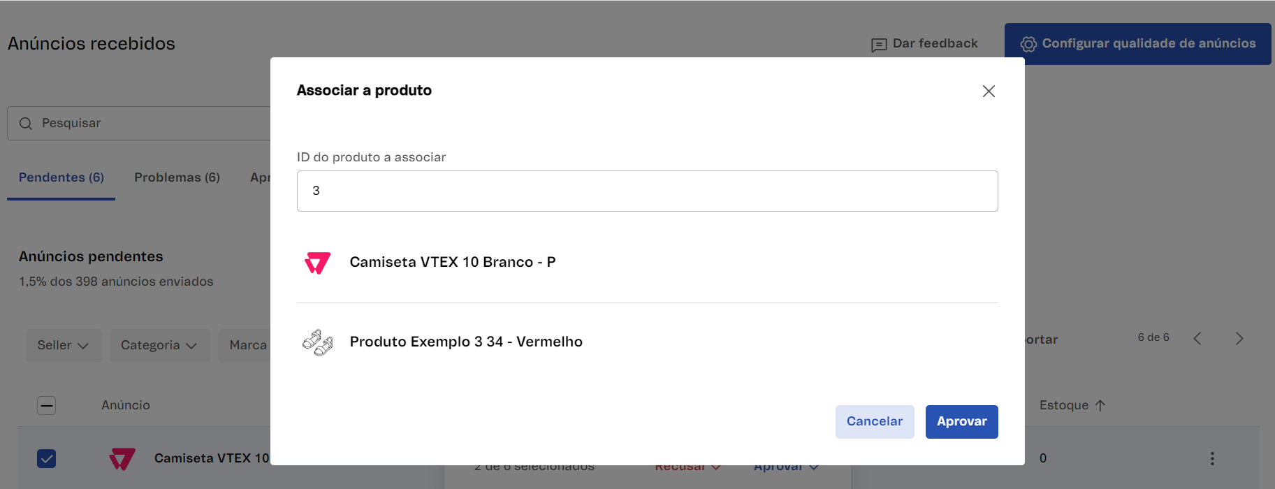Associar a SKUs. - Preencha o ID do SKU a associar para cada SKU que está sendo aprovado.