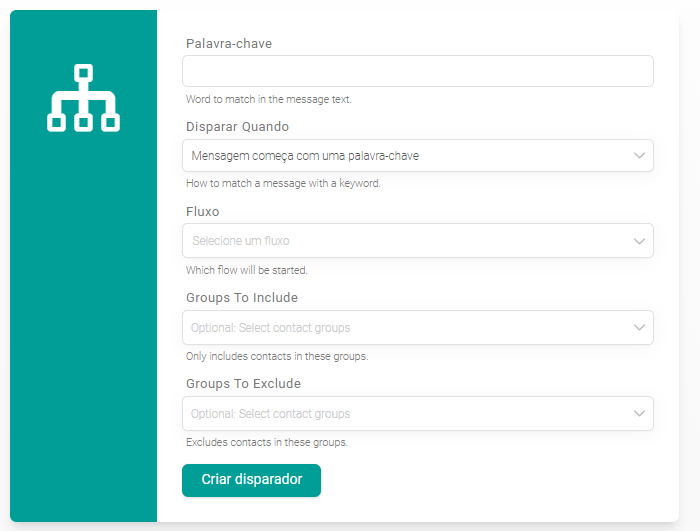 Escolha o fluxo que você deseja iniciar, para quais contatos ou grupos o fluxo será ou não transmitido.