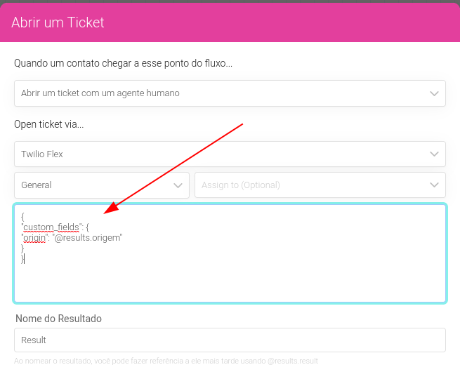 de Ticket, no formato json, com cada campo como atributo de custom_fields,