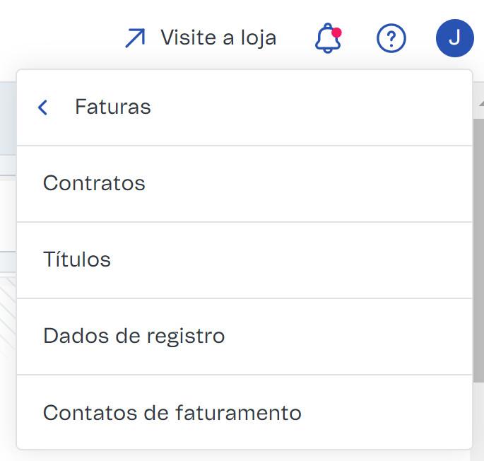 Para acessar essa página, clique no seu avatar, que pode ser identificado pela inicial do seu email, e clique no botão Faturas. Selecione a aba que você deseja visitar, como Contratos, Títulos, Dados de registro e Contatos de faturamento.