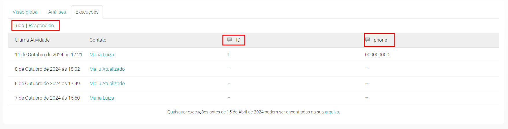 A aba de ""Runs"" oferece acesso a todos os dados brutos, que podem ser exportados e utilizados em outras aplicações para validação de informações. Na aba ""Execuções"", você pode optar por visualizar todos os dados ou apenas os contatos que responderam. Os resultados salvos nos cartões são exibidos em colunas.