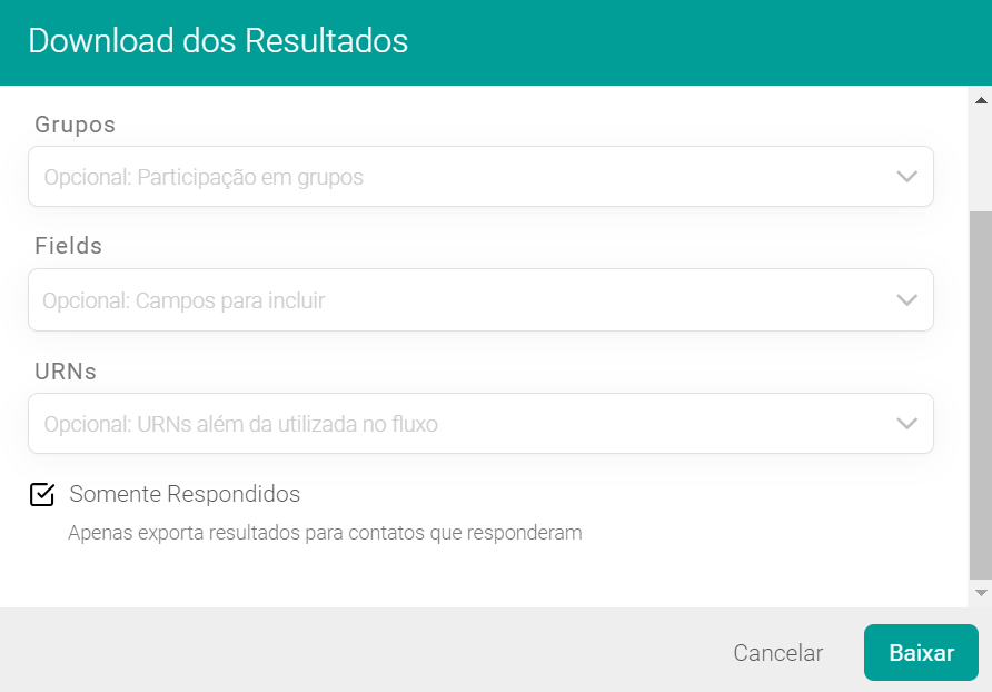 Antes de exportar, você pode selecionar as opções Grupos, Campos de Contato (Fields) e URNs. Se você marcar a opção ""Somente respondidos"", a exportação será limitada apenas aos contatos que enviaram alguma resposta no fluxo que está sendo exportado.