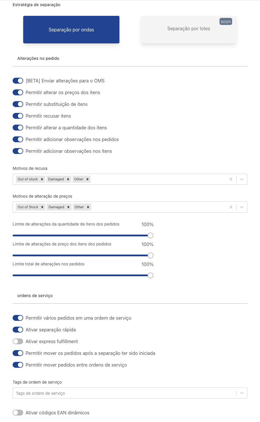 - Enviar alterações para o OMS: permite enviar as alterações feitas pelo separador para o OMS da VTEX. Você pode ativar ou desativar a opção.