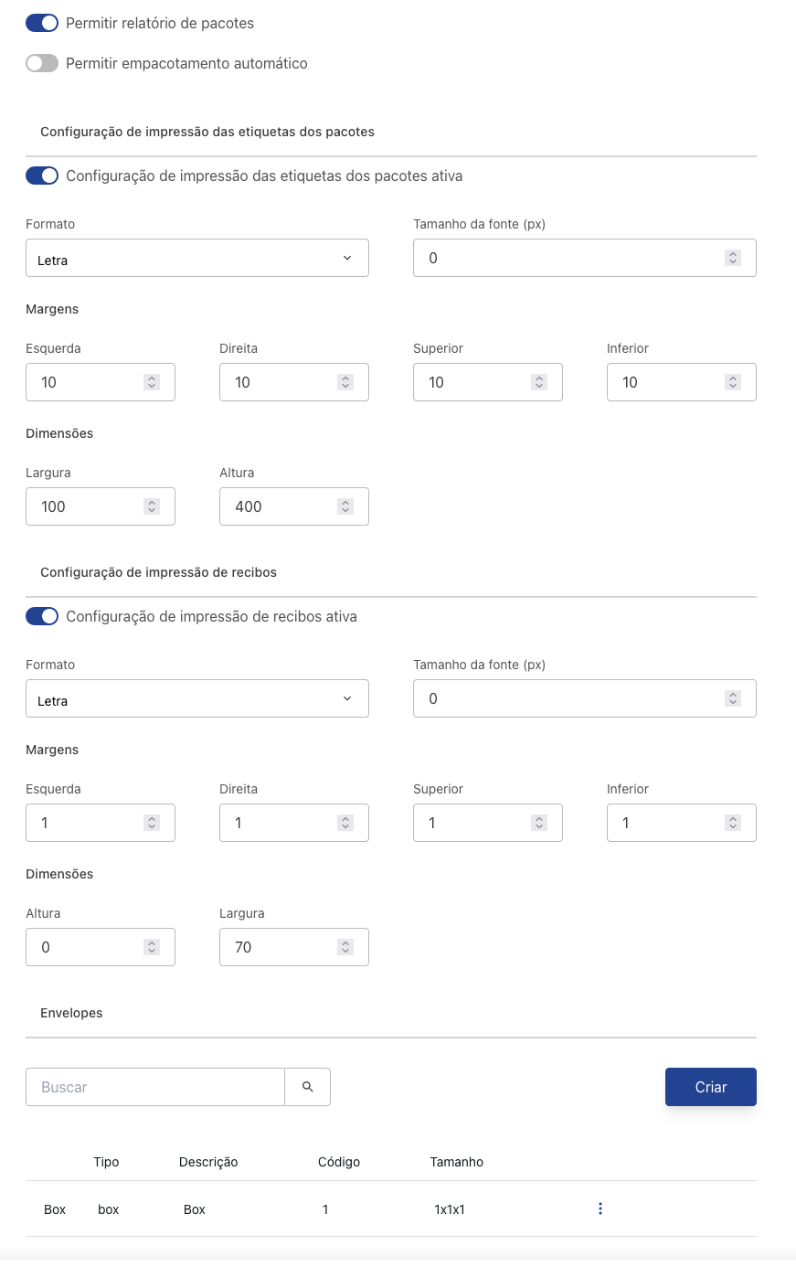 - Configuração de impressão das etiquetas dos pacotes ativa: ativa ou desativa a possibilidade de editar as características das etiquetas.