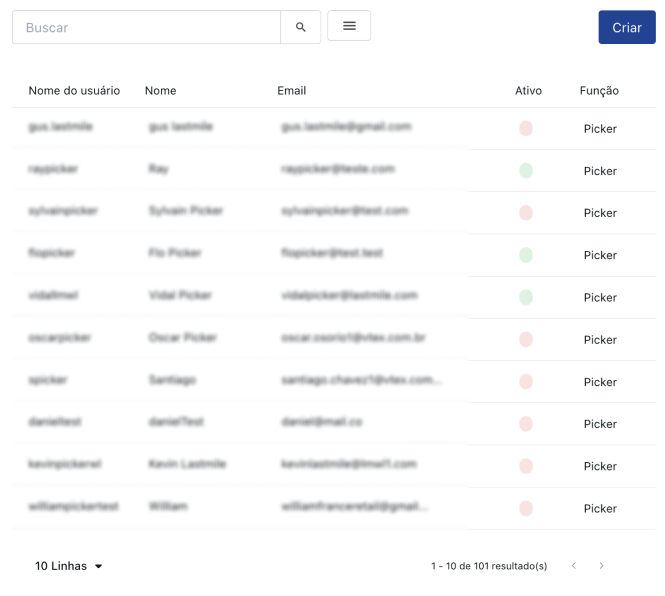 Nesta aba, você fará o gerenciamento dos usuários, admins e separadores, da sua operação VTEX Pick and Pack. Usuários com permissão Admin terão acesso ao Admin VTEX e poderão realizar alterações na ferramenta. Usuários com permissão Separador terão acesso apenas ao aplicativo do VTEX PIck and Pack.