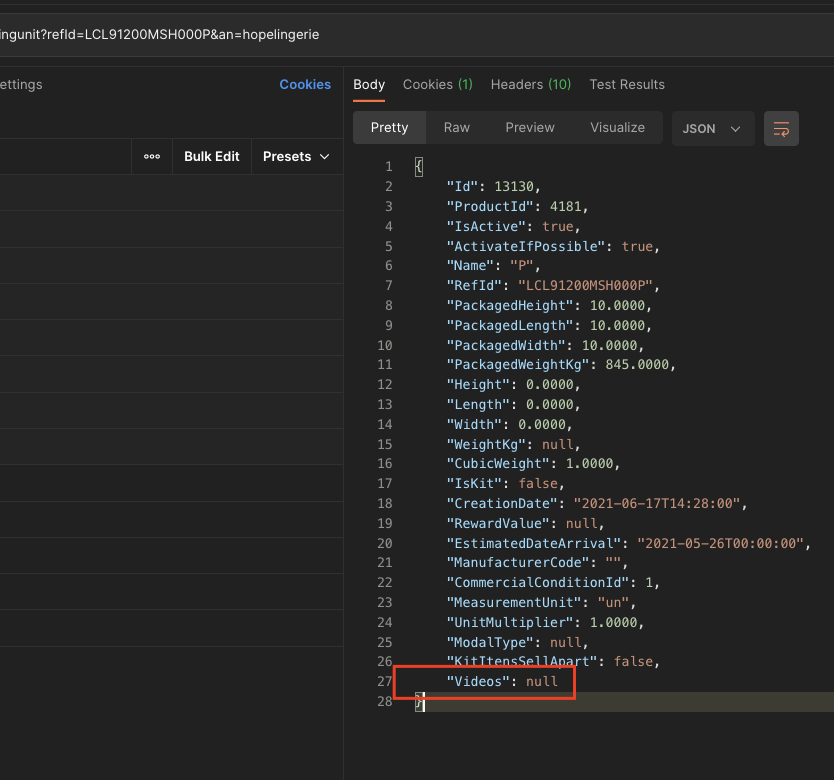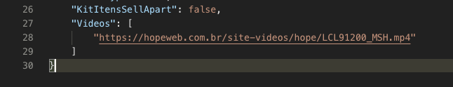 - Do a request that returns a value on the field Videos,f or example: https://catalog.vtexcommercestable.com.br/api/catalog/pvt/stockkeepingunit/13130?an=hopelingerie