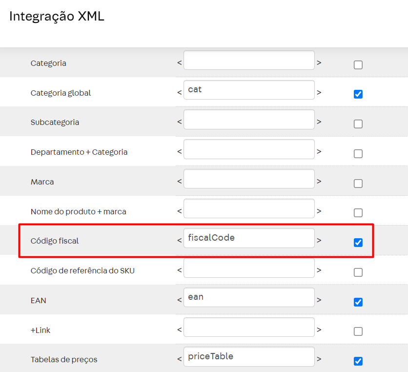 O campo de código fiscal XML do Catalog Integration não está sendo renderizado