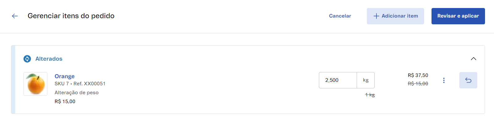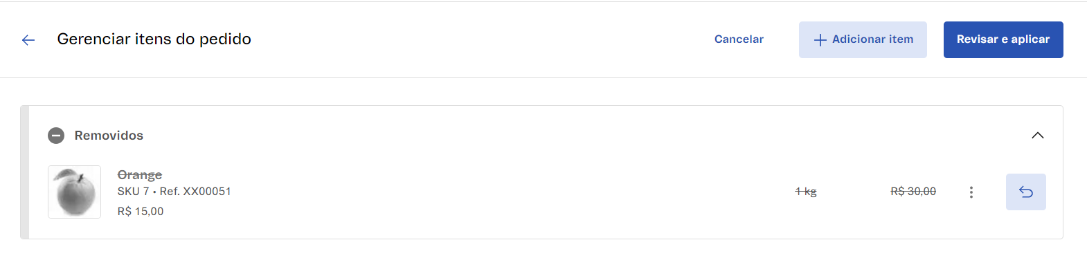Na página Gerenciar itens do pedido, se você se arrepender de alguma alteração realizada, é possível desfazê-la. Para isso, clique no ícone seta curva Desfazer ação. Feito isso, uma mensagem de confirmação vai aparecer: “Alteração desfeita”, e a ação terá sido revertida.