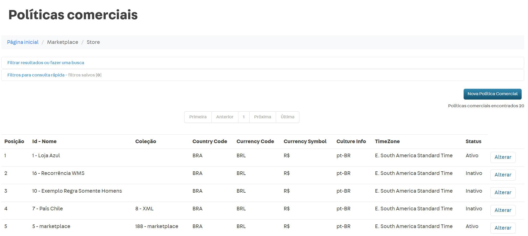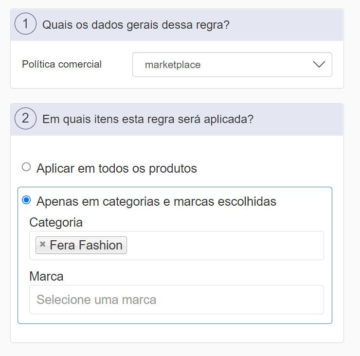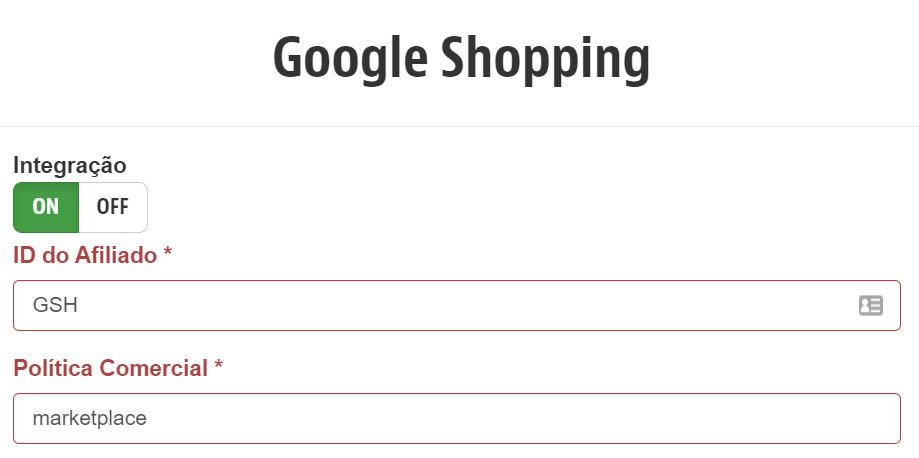 No exemplo acima, a política comercial "Marketplace" está aplicada na integração com o Google Shopping.