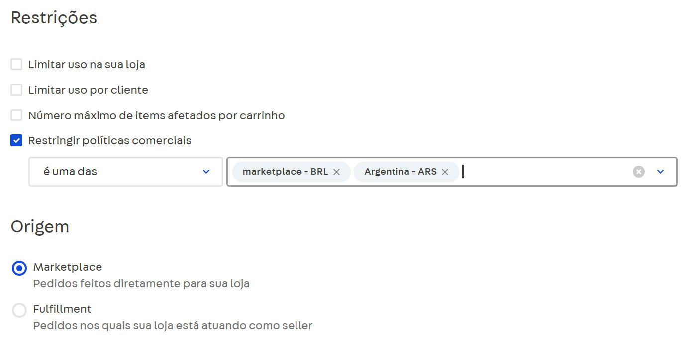 No exemplo acima, a promoção será aplicada somente a pedidos das políticas comerciais "Marketplace-BRL" e "Argentina-ARS", onde a loja atua como seller. A promoção não estará disponível no storefront da loja VTEX.