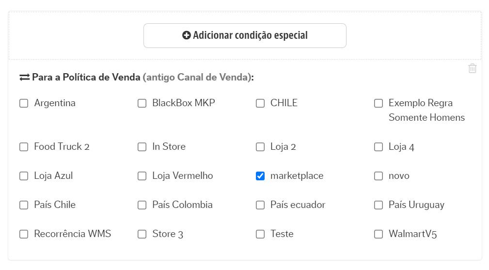 Sellers que transacionam o pagamento das vendas de seus produtos em um marketplace podem criar condições especiais de pagamento e aplicá-las em marketplaces específicos por meio de políticas comerciais. Se sua loja deseja oferecer mais opções de parcelamento para pedidos em marketplaces parceiros, é necessário criar uma condição especial e associá-la à política comercial vigente nesses marketplaces.