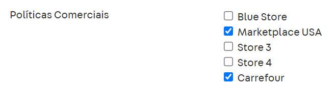 No exemplo acima, o produto estará disponível apenas para canais de venda utilizando as políticas comerciais "Carrefour" e "Marketplace".