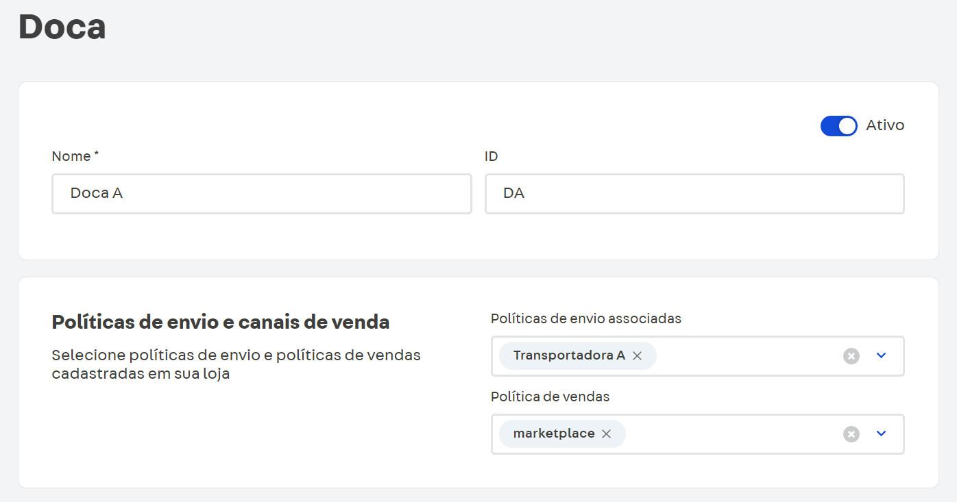 Ambas configurações são realizadas no módulo Estratégia de Envio. Ao criar uma doca, é preciso indicar quais políticas comerciais ela atenderá. Isso torna as políticas de envio associadas a essa doca disponíveis para as políticas comerciais vinculadas. Em seguida, é necessário relacionar o estoque desejado a uma doca, para tornar seu inventário disponível para todas as políticas comerciais associadas à doca.