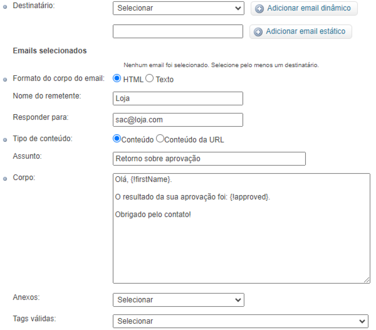 Envia um email para destinatários dinâmicos (contidos no registro) ou estáticos. O email a ser enviado é personalizado, podendo ser um texto, HTML ou até mesmo o conteúdo de uma URL. É possível inserir anexos e o campo Tags válidas mostra como inserir valores de campos do registro.