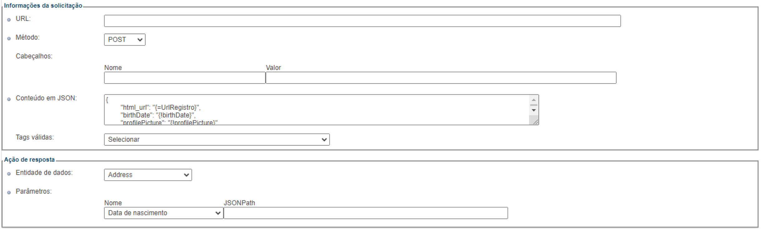 Preencha a seção Informações da solicitação com as informações da requisição a ser enviada. Na seção Ação de resposta, você poderá indicar como as informações da resposta deverão ser salvas no Master Data.