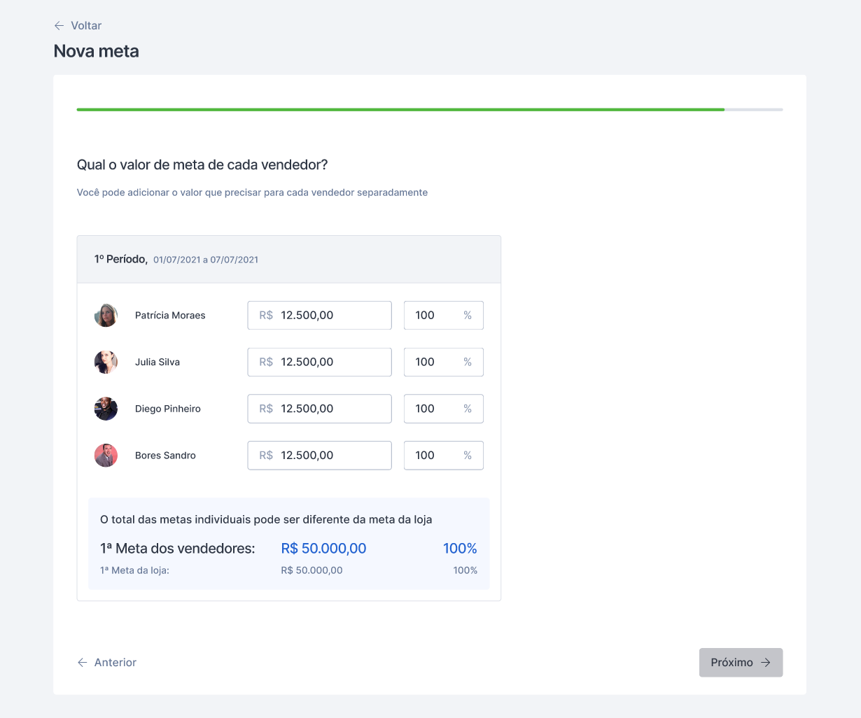 - O total das metas individuais deve ser igual ao valor total da meta da loja.