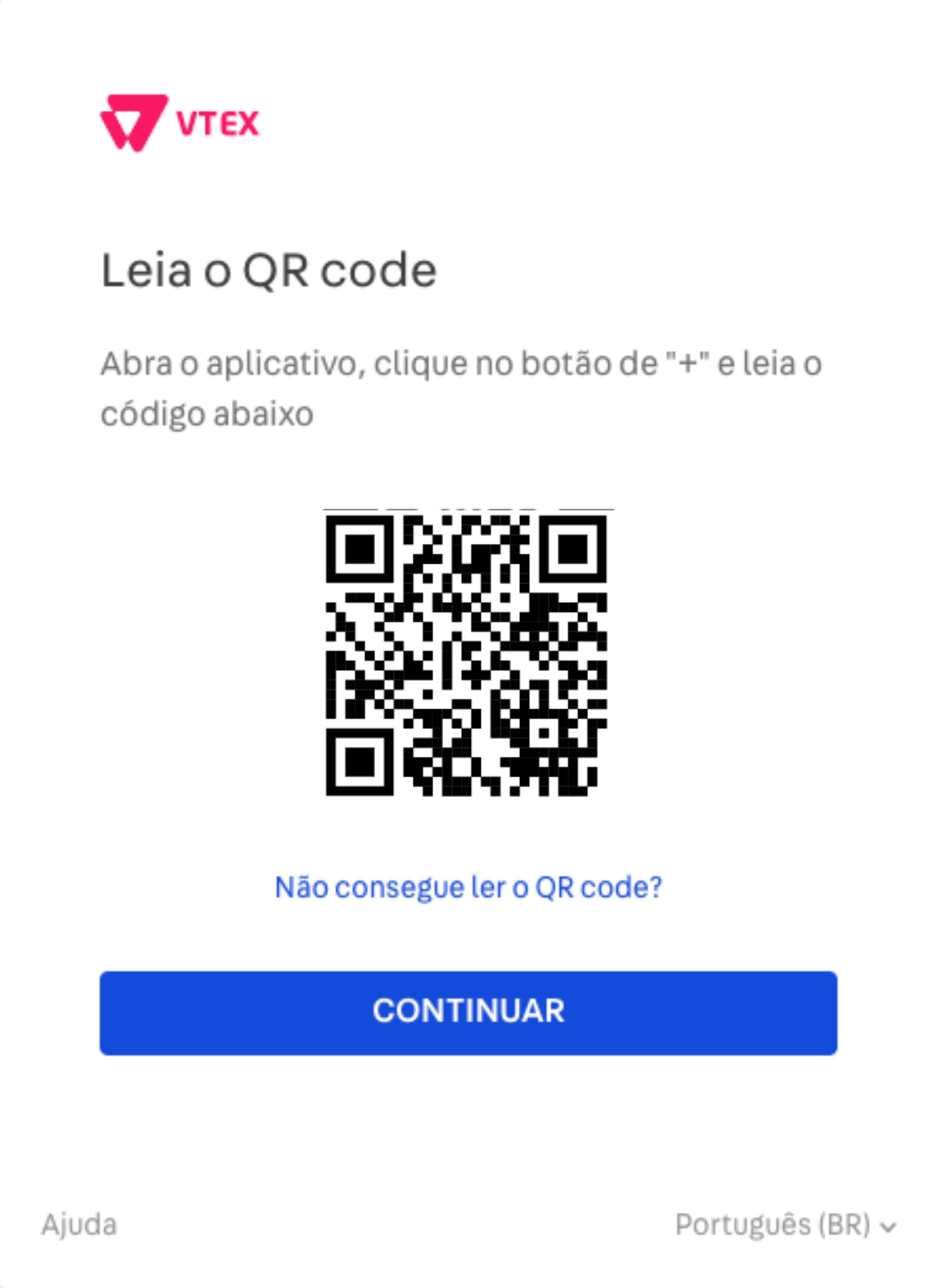 - Use o aplicativo para ler o QR Code com a câmera do seu celular. Sua conta da VTEX será adicionada ao aplicativo, com um código de 6 dígitos.