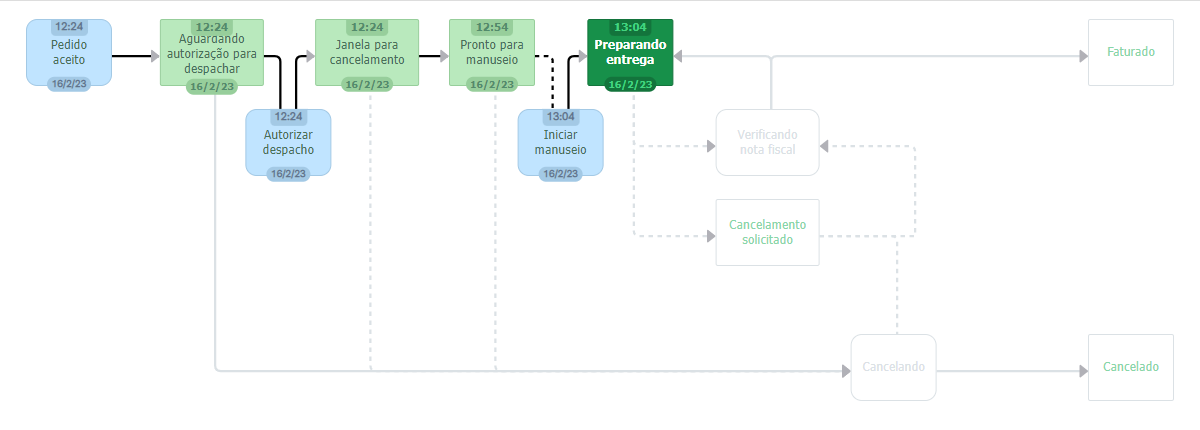 Observe que os status do fluxo completo do pedido (fluxo visto pelas lojas responsáveis pela venda e entrega dos pedidos) coincidem com os status de marketplace e seller. Alguns status podem ser vistos via API, mas não ficam visíveis no fluxo do pedido visto no Admin no módulo Todos os pedidos.