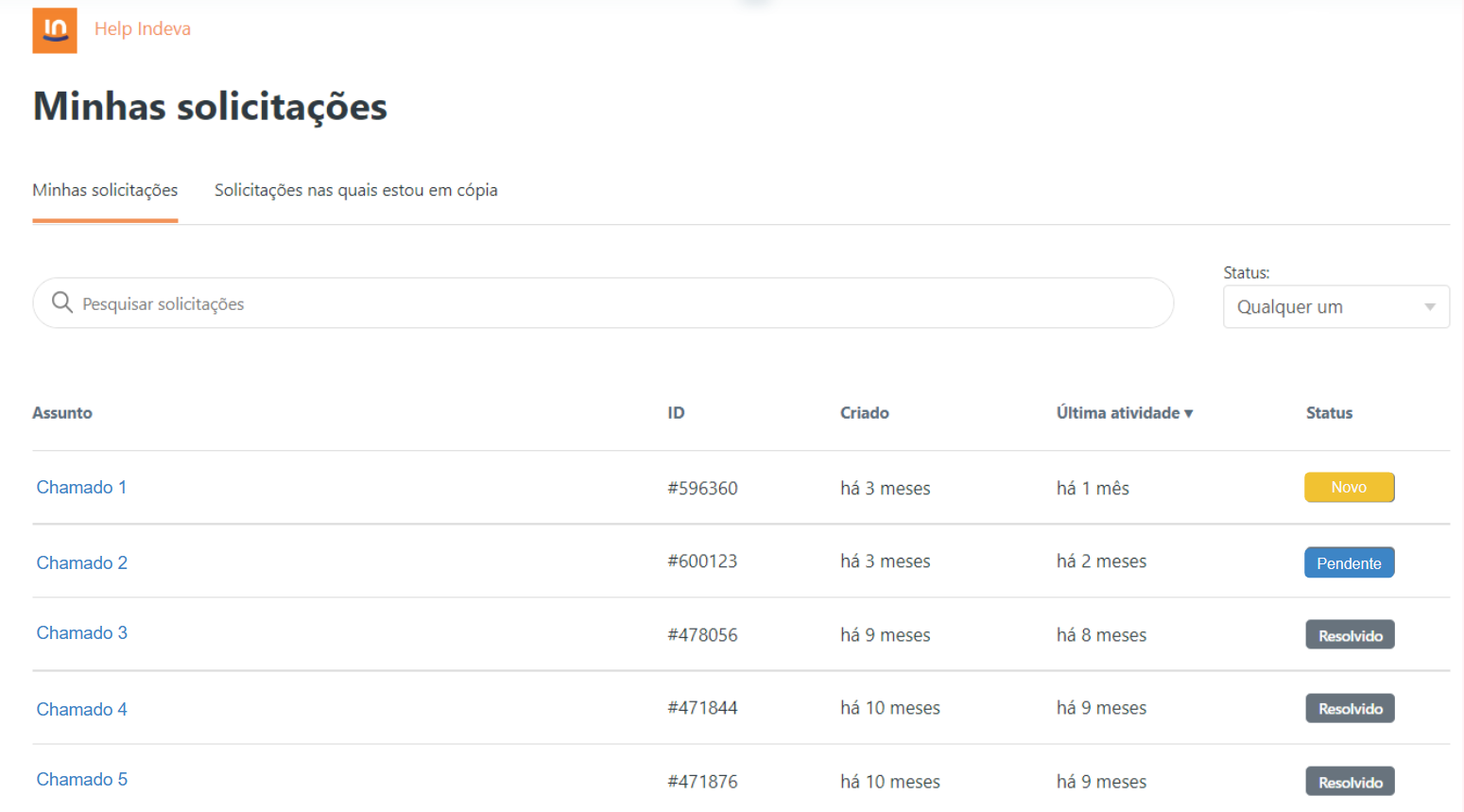 Sempre que um chamado é registrado com os times de Suporte ou Financeiro, ele fica disponível no painel de solicitações da Indeva, é permitido visualizar todas as solicitações abertas e acompanhar o status de cada uma.