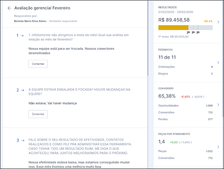 Use o botão Comentar para adicionar observações ou orientações às respostas dos gerentes ou vendedores responsáveis.